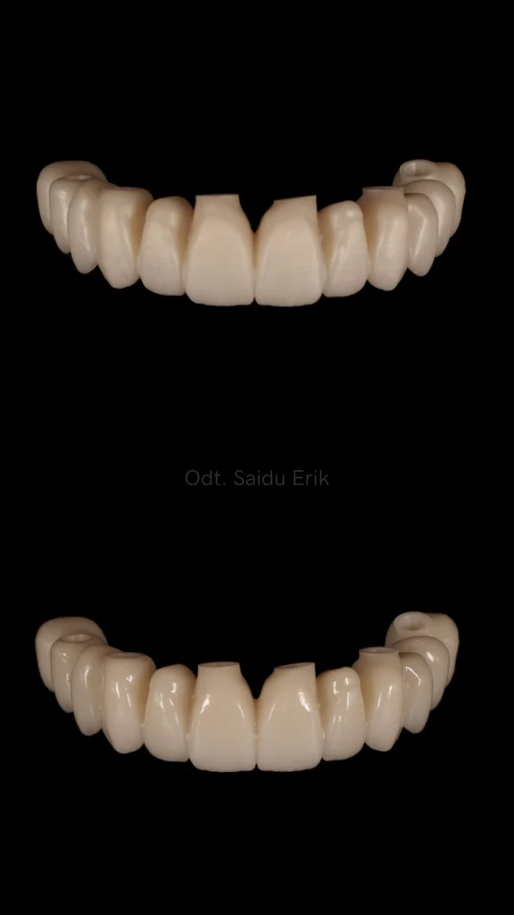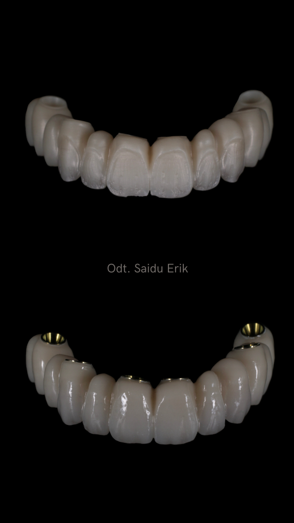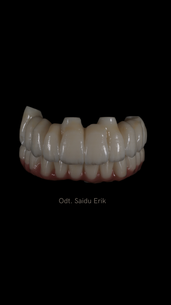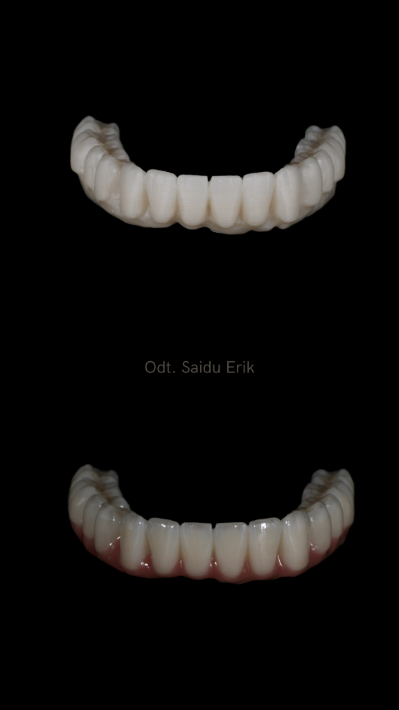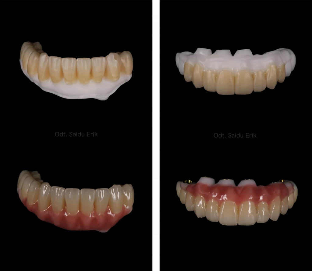 Le protesi sono state realizzate con una sottostruttura in zirconia bianca altamente resistente, la parte dentale con zirconia altamente traslucente ed infine la parte gengivale è stata ceramizzata in maniera tradizionale.