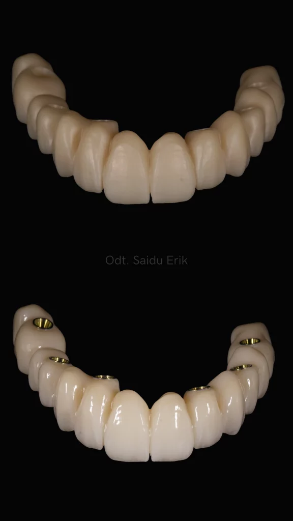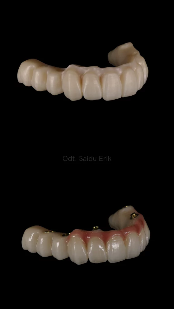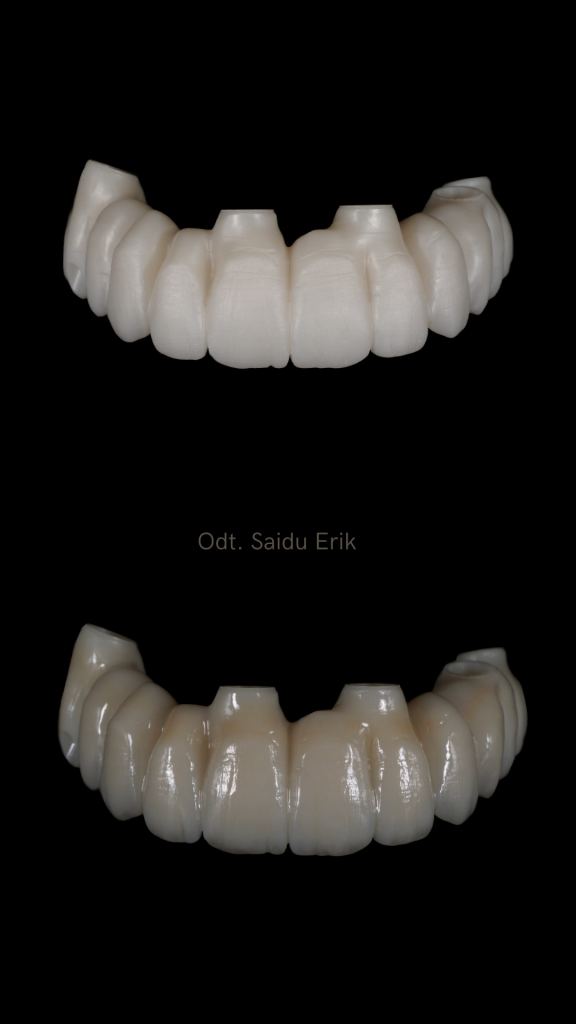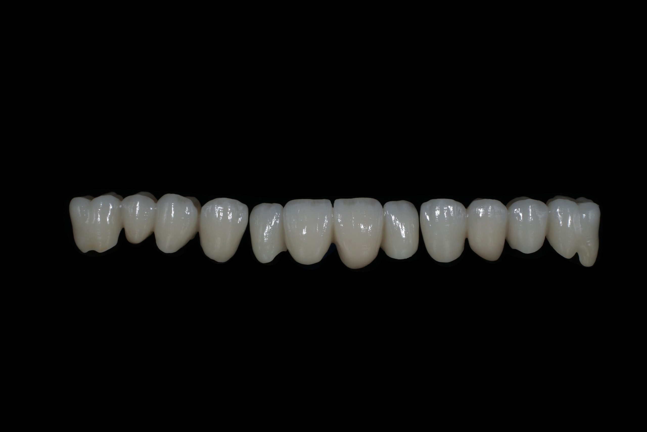 Le protesi sono state realizzate con una sottostruttura in zirconia bianca altamente resistente, la parte dentale con zirconia altamente traslucente ed infine la parte gengivale è stata ceramizzata in maniera tradizionale.